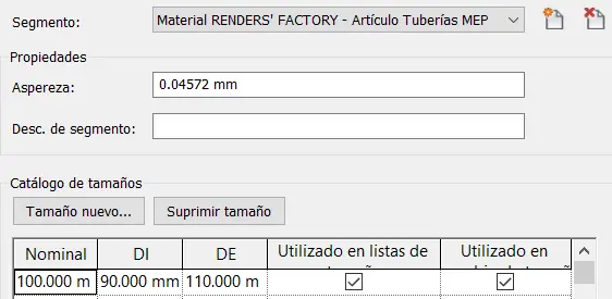 Para hacer más sencilla la comprensión de los conceptos de elevación de las tuberías, vamos a proceder a crear una nueva familia de Tipo de tubería específica para esta explicación. Asimismo, vamos a generar un nuevo Segmento, para el cual configuramos un único Tamaño, como vemos en la imagen, al que asignamos un valor de Diámetro Nominal de 100mm, un Diámetro Interior (DI) de 90mm y un Diámetro Exterior (DE) de 110mm.