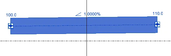 El extremo de la tubería seleccionado como Punto de control (la cola de la flecha) siempre permanecerá en su elevación original, siendo el extremo contrario el que sufrirá un incremento de su elevación. Como se deduce de la imagen, hemos seleccionado el extremo izquierdo como Punto de control, de ahí que continúe a 100mm de elevación.