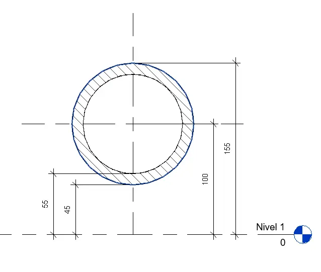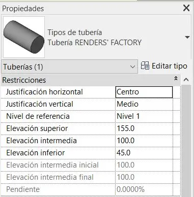 Como se observa en la imagen anterior, hemos seleccionado introducir nuestra tubería de ejemplo con un valor de Elevación intermedia de 100mm. Esto quiere decir que el eje de la tubería estará a 100mm sobre el nivel en que se ha modelado, en este caso el “Nivel 1”.